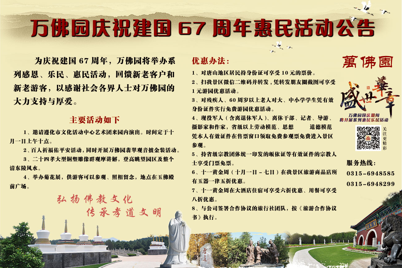 为庆祝建国67周年,万佛园将举办系列感恩、乐民、惠民活动,回馈新老客户和新老游客,以感谢社会各界人士对万佛园的大力支持与厚爱。